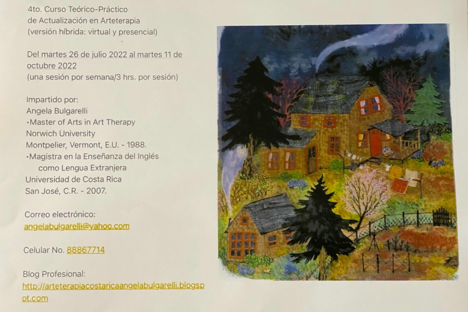 Angela Bulgarelli, Master en Arteterapia (Norwich University, Vermont, E.U., '88 / Exbecaria del Programa Fulbright de Posgrado), es pionera de esta especialidad en su país, Costa Rica. Su trabajo incansable, introduciendo la arteterapia como medio de intervención, ha sido riguroso, responsable, serio y contínuo desde 1988. Este blog profundiza diversos aspectos de la especialidad de la arteterapia, desde la perspectiva de una profesional experta (Inicio de este blog: abril del 2010).